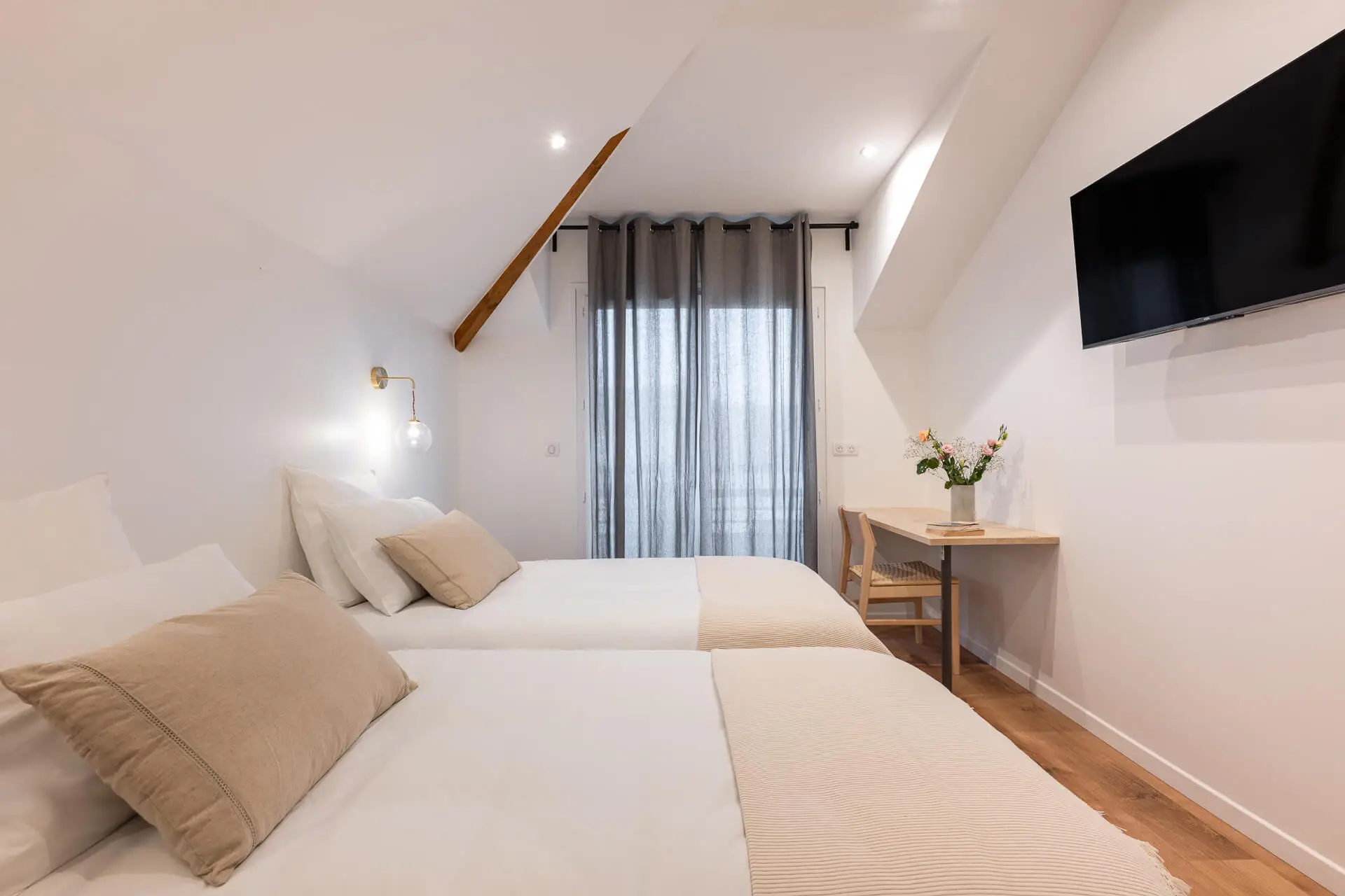 La Chambre Twin Deluxe de La Villa Le Bourget propose 30 m² avec deux lits séparés (140 cm et 90 cm), idéale pour deux voyageurs souhaitant chacun leur espace. Elle convient aussi bien aux collègues en déplacement professionnel qu’aux amis ou aux proches.